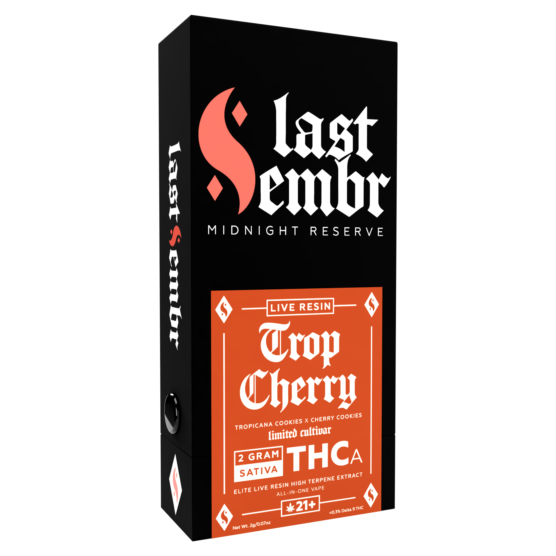 Last Embr Trop Cherry Live Resin Disposable offers a bright fruit-forward profile with sweet cherry, tropical citrus, and subtle tartness. The live resin preserves its vibrant terpene expression, delivering a flavorful and aromatic experience in a portable format.